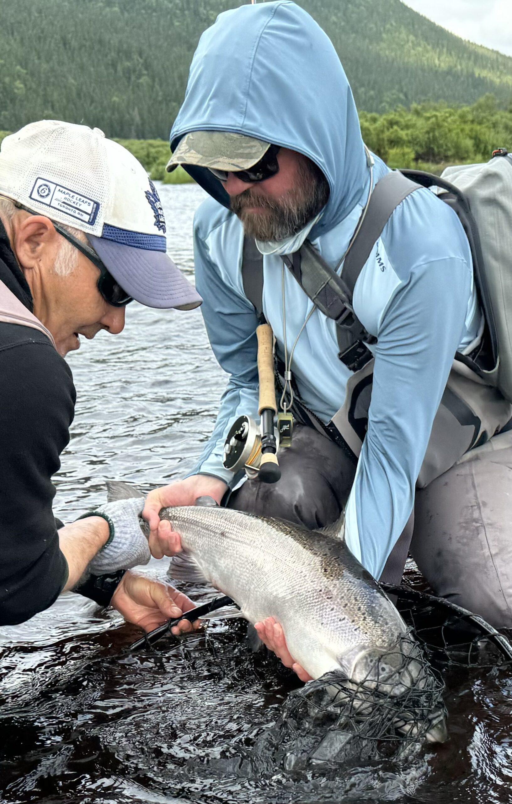 While this year was off due to the high water and few fish in the river during our week, we still landed around 100 fish with seven rods for five and a half days of fishing (we did not get into camp until Monday morning due to weather and left Saturday afternoon to avoid hazardous flying conditions on the coast). We averaged about 30 percent “big fish” or salmon in their second run up the river. Personally, I did well owing simply to my persistence. Like I said before, keep the fly in the water as much as possible. I also suggest clinging to a positive attitude and reminding yourself that you have come all this way, endured clouds of bloodsucking black flies, treacherous flights and wading, all to catch a fish that is not supposed to eat for nine months with something’s that is not food and then let it go – deep breaths.