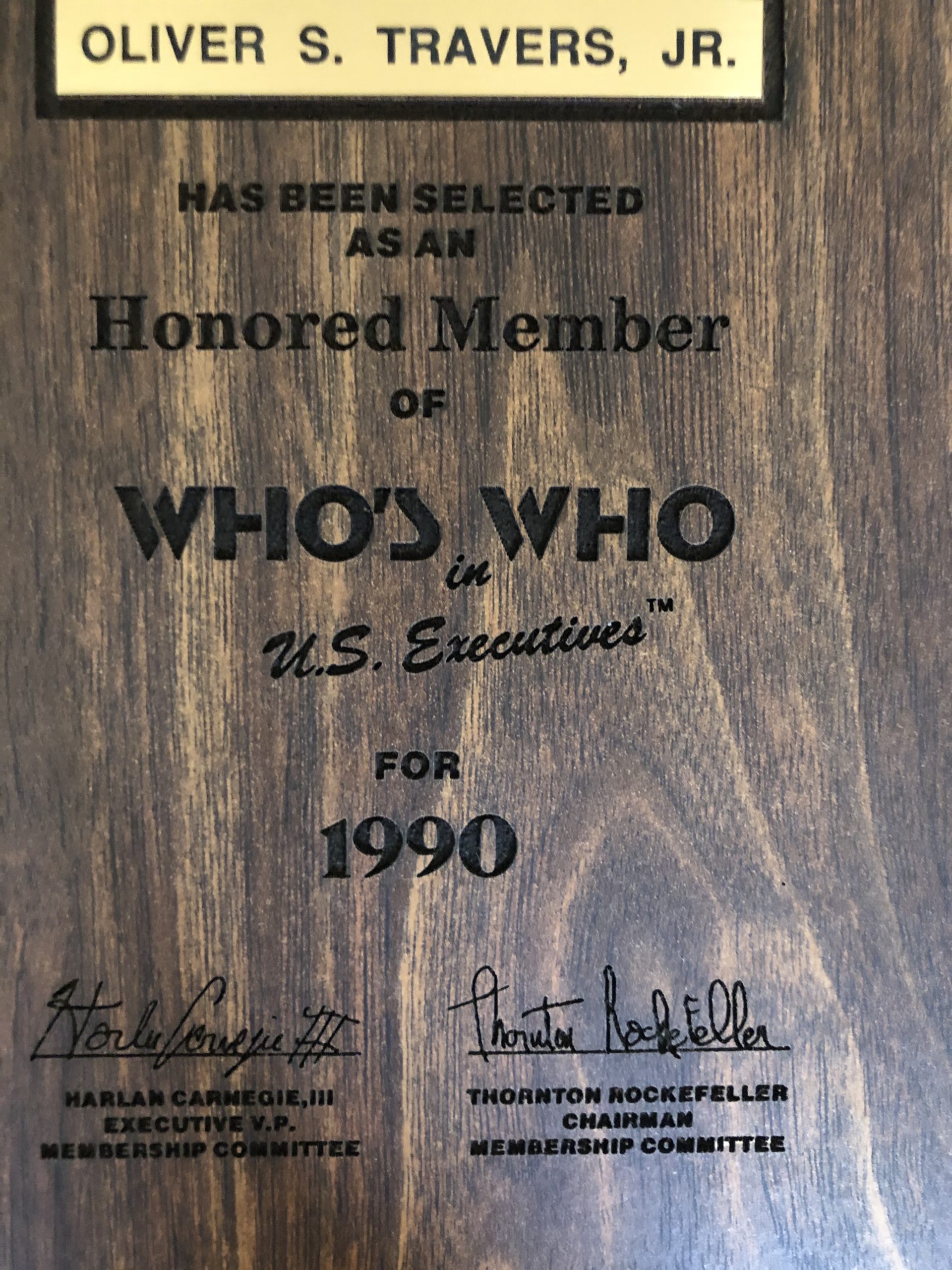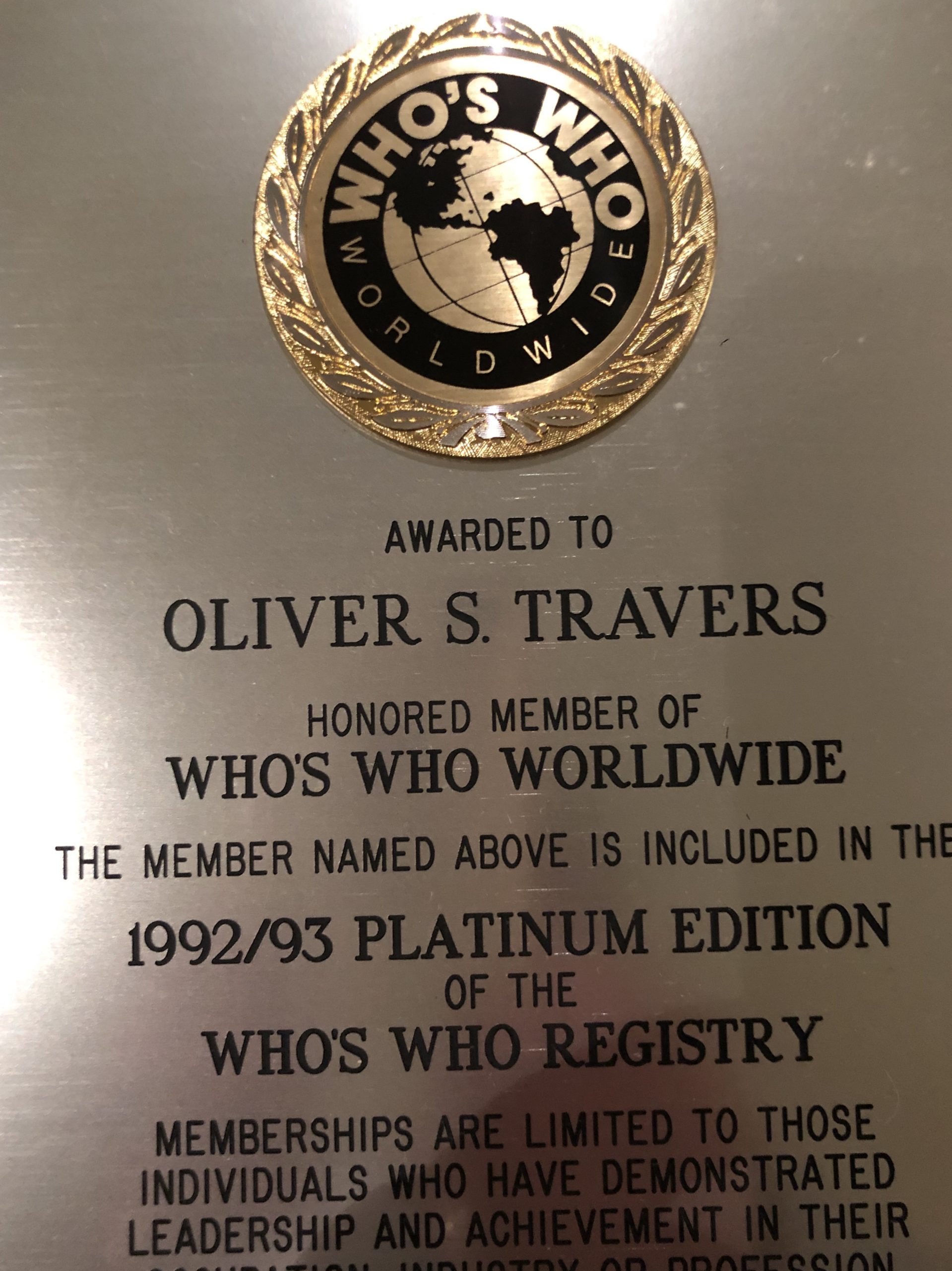 Business served and board member of: Oliver Slater Travers Jr. was the director of many companies and on the board of many non-profits: President Schenuit Industries and Allegheny International and on the board of Maryland National Bank, Waverly Press, Londontown, Hittman Melnor Corporation, Junior Achievement, Boy Scouts of America, Kernan Hospital, Young Presidents Association