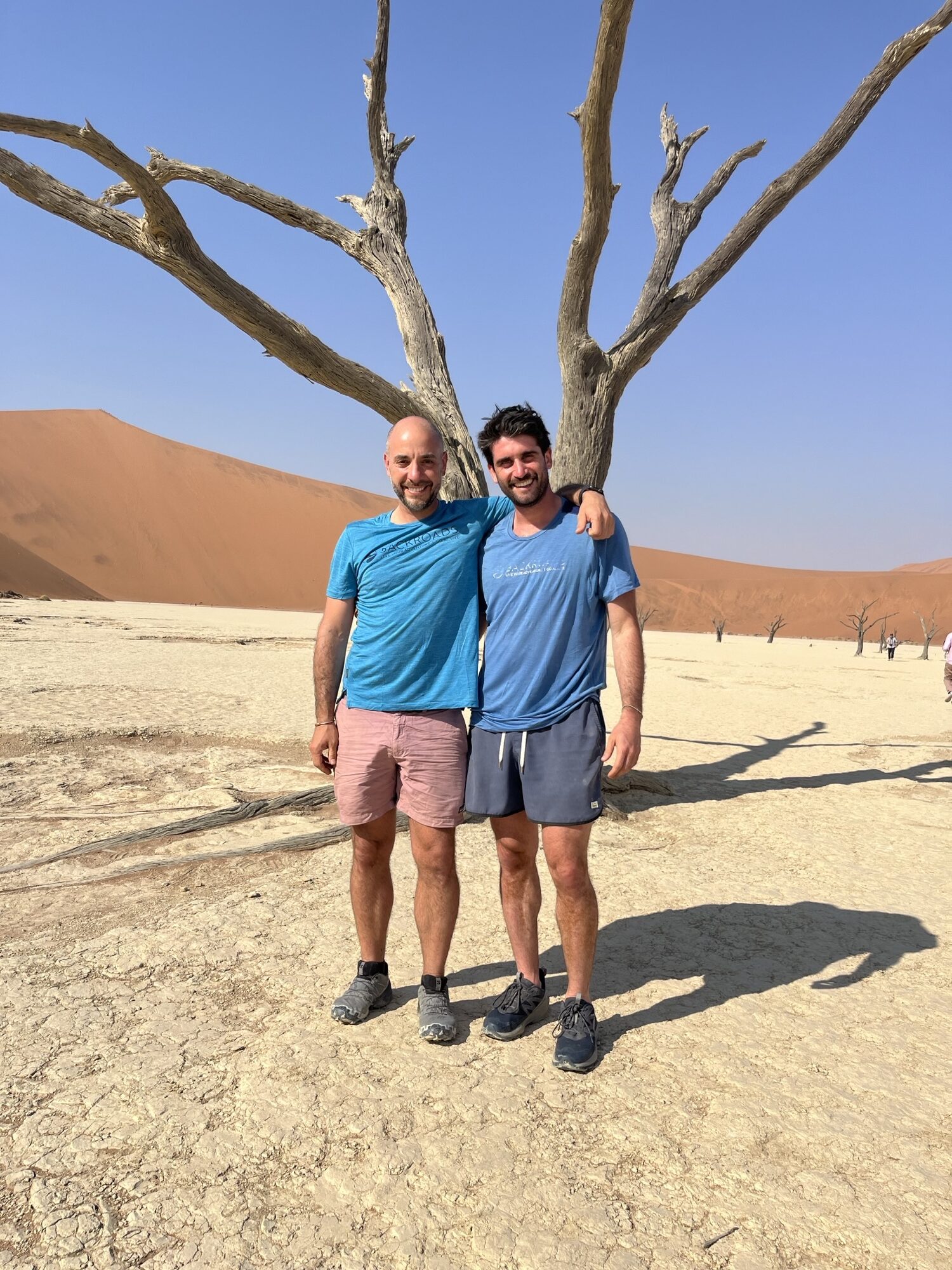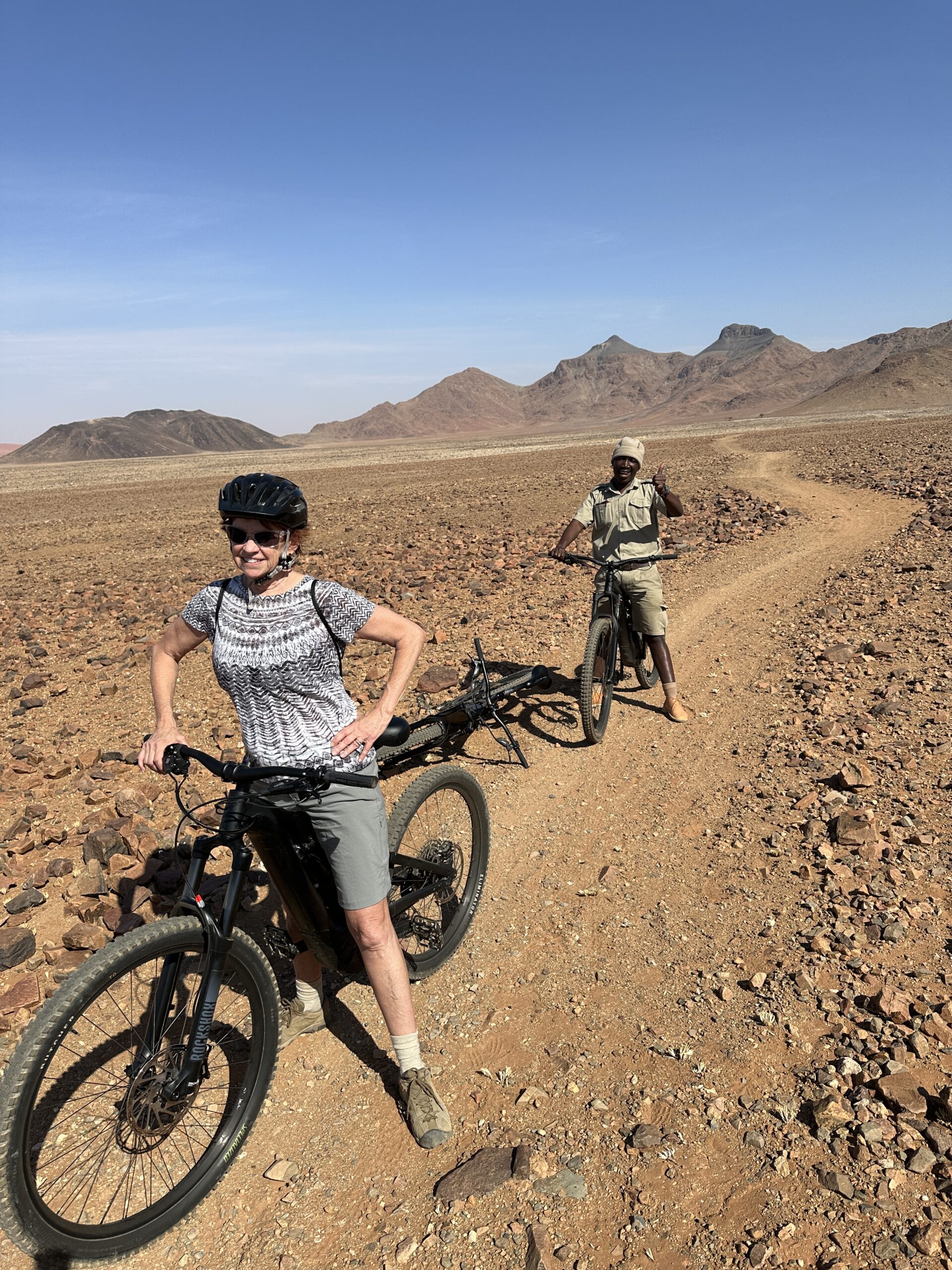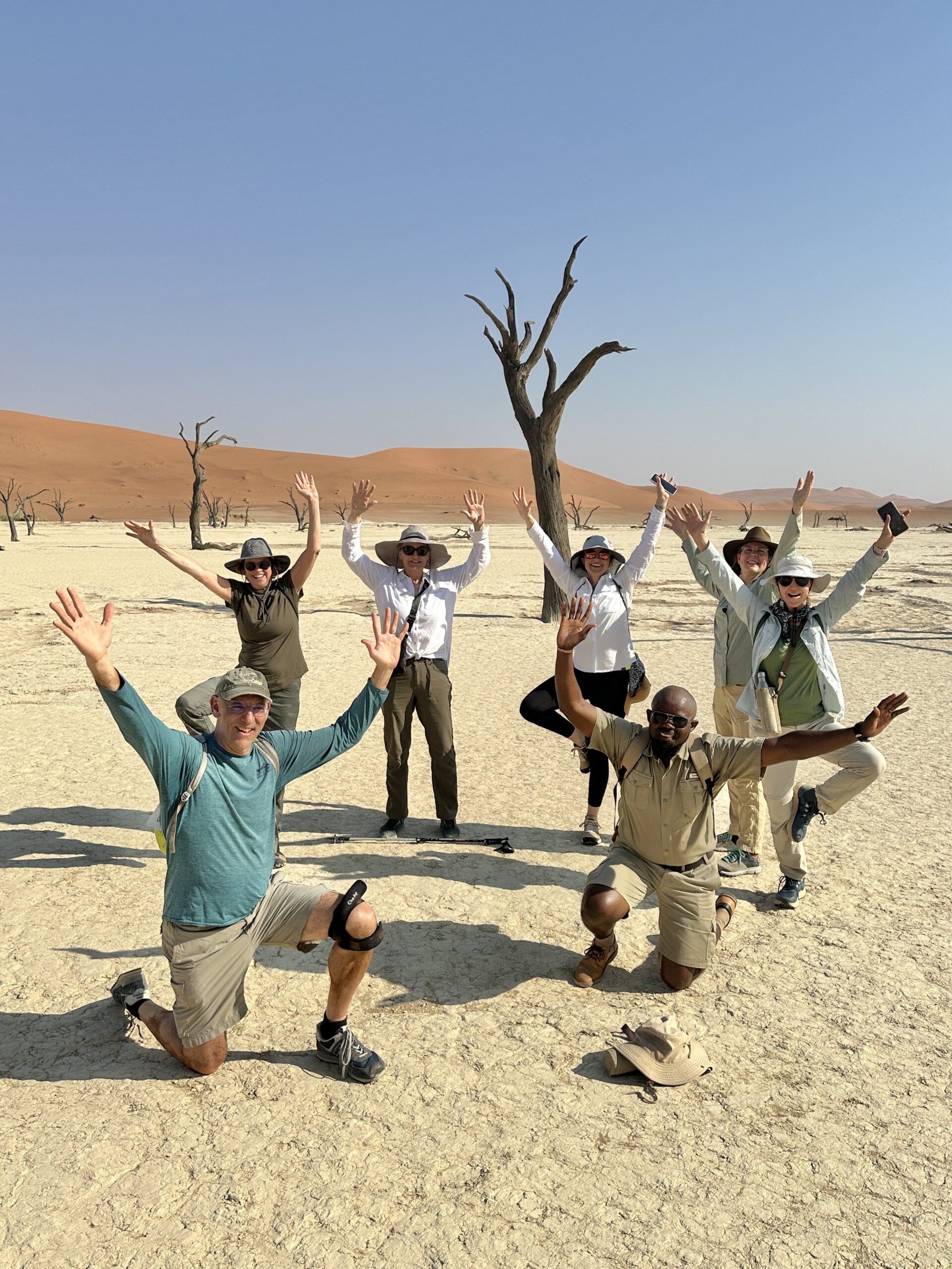 This trip to three African countries: Namibia, Botswana and Zambia was provided by Backroads and “Backroads” exceeded our expectations. Some of us ended up in Zimbabwe and had a day there and I bungee jumped off the Victoria Falls bridge 360 feet wow. Of from the start and each country below on tabs to left show more detail. Again Backroads provided this trip and it exceeded everyone’s expectations from the safaris to the hiking, biking, boating and the hotels and food and guides and team leaders were amazing. ok a brief overview on Namibia. Our Team Leaders below: Eli and Eliav below were awesome and inspiring