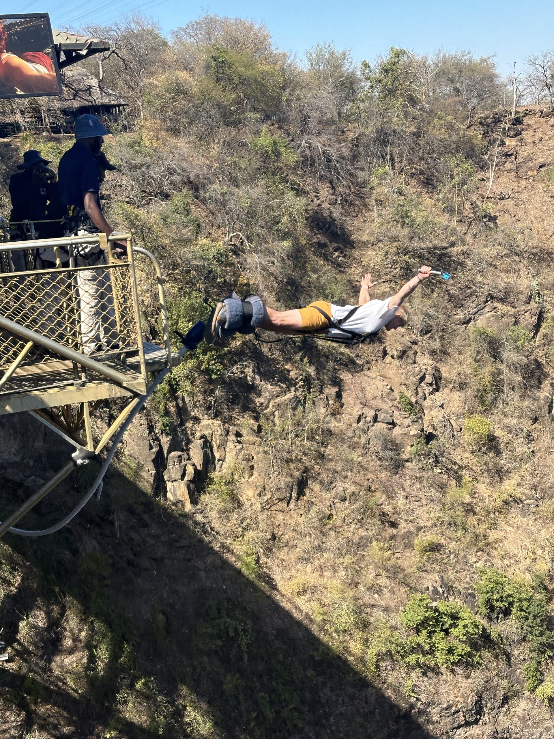 from here on the afternoon of day 7 we flew again on a private plane to Zambia to a great lodge called the Sanctuary Sushi and Chuma which was a great lodge on the river. That night we took a river cruise on the Zambezi and and the ext day did a Victoria Falls trek, a bungee jump off of Victoria Falls and game drive as well as a a helicopter ride our hotel below the Sanctuary Sussi and Chuma lodge and from here we boated on the river so saw hippos crocodiles and elephants and then we hiked the Victoria Falls to the base with photos below and bungee Jumped